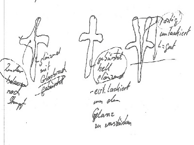 Den ersten Gedanken zur Erstellung eines Kreuzes hatte ich im März 1997, gut 2 ½ Jahre vor der Fertigung. Auf der Suche nach ausgefallenen Materialien fand ich im Bergischen Land auf einem Schrottplatz die Schmiedegrate aus der dort beheimateten Zangenproduktion. Mir fiel die lamellenartige Struktur dieser Teile auf.Bei den ersten Versuchen, diese zusammenzulegen, ergab sich eine gestreckte Form. Durch die offene Form der Teile schien es, als wären diese gezeichnet worden. Als das Motiv (Kreuz) gelegt war, verlor sich die Optik des einzelnen Elements.
