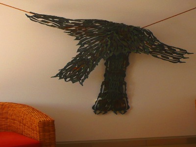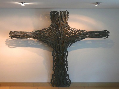 Aus der Installation "Dialog" ist dies das zweite Kreuz mit dem Titel "Abgehangen". Erstellt aus dem Gedanken heraus wie wir Abends nach der Arbeit leichtfertig unsere Jacke über eine Stuhllehne werfen. Legen wir in der heutigen Zeit, das ist hier die Frage, vielleicht ebenso leichtfertig unseren Glauben oder auch andere Traditionen ab?