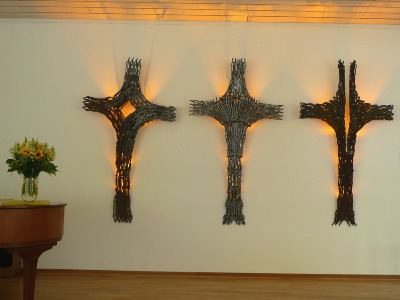 Zentral das "Jesuskreuz", rechts das Kreuz "Abgewendet" und links "Zugewandt"